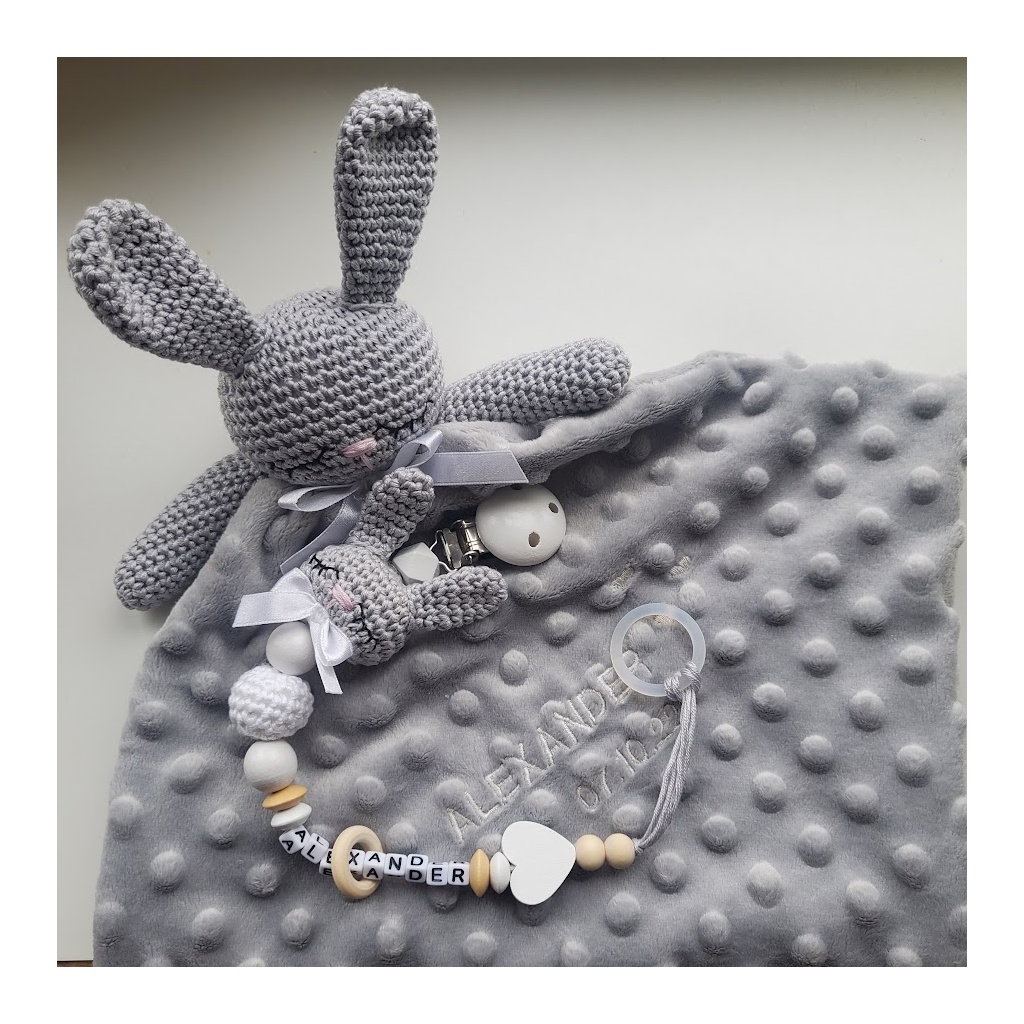 Beebisinise jänkuga hall kaisulapp ja nimeline lutikett