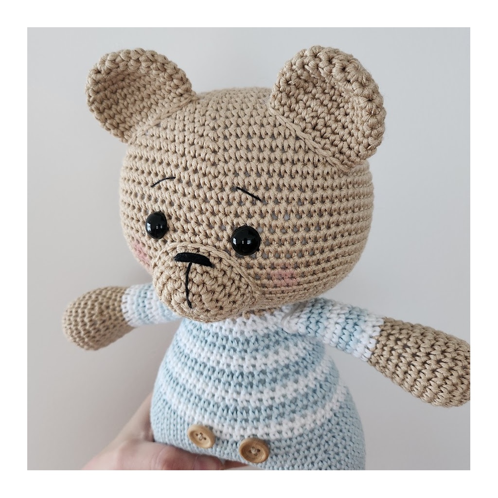 Käsitsi heegeldatud mõmm on valmistatud 100% puuvillasest lõngast ja täidetud pehme kerakiuga. Mõmm on beebisõbralik, masinpestav (soovitatav õrnpesuga) ja ideaalne kaisutamiseks juba esimestest elukuudest.
