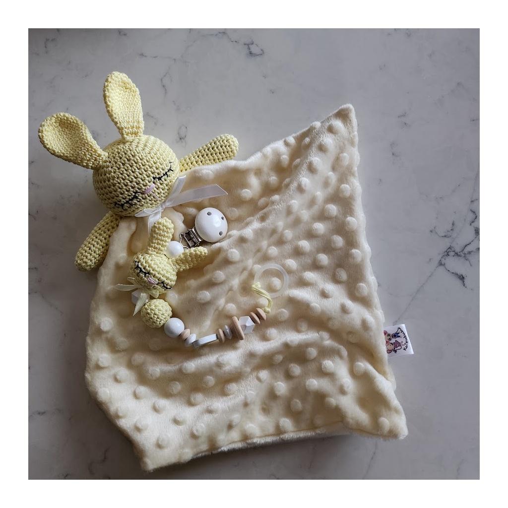 Lutikett ja kaisulapp on valmistatud käsitööna kvaliteetsest puuvillasest lõngast, mis on pehme, vastupidav ja beebile nahasõbralik. Kaisulapp on mõnusast minky-fliisist, pakkudes beebile lisamugavust ja turvatunnet.